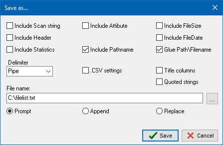 Individual fields are separated (delimited) by a pipe character (|). When HashTFS is used for the first time, the file list must at least contain the filename of the files that have to be checked. Status, Date, Time, Function Value and Value2 are added by HashTFS. An initial file list can be created manually, using a standard (UTF-8) text editor or by clicking the [New] button followed by the [Add] button. To generate a file list with ScanDir or ScanTFS use the following options when saving the file list: [v] Include Pathname; [v] Glue Path\Filename; Delimiter= Pipe;