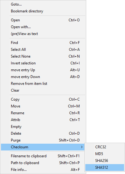 Display a sub-menu with the available checksum options. The calculated checksums are displayed in a new window, from which they can be copied to the clipboard or saved to a text file.CRC32 Calculate CRC32 checksum for selected files. CRC32 is the fastest checksum, but it is easy to manipute (less secure). CRC32 is often used by programs like 7-Zip, WinZip and WinRar.
