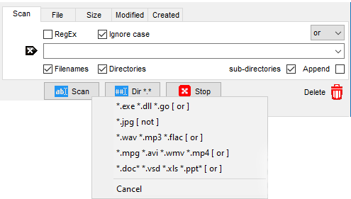 [-] Append results. Use this checkbox if the scan results should be added to the current item list. Normally, the item list is cleared before every new scan operation. If the [Dir *.*] button is pressed, the current item list is always cleared.File tab