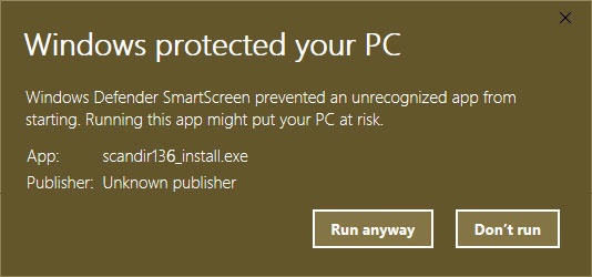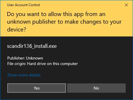 During installation of ScanDir additional security messages may appear. The